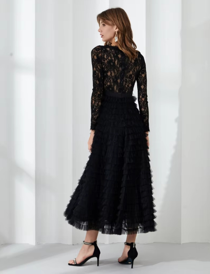 Eleganter Damen Zweiteiler mit Spitze in Schwarz Rock mit Bluse im Set