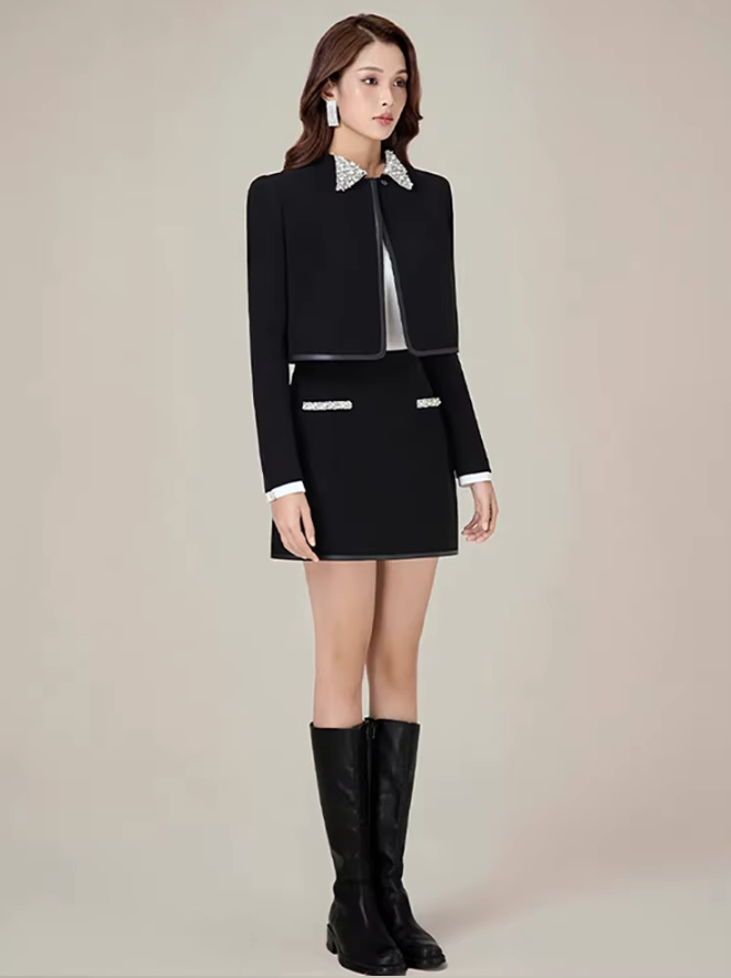 Patchwork Mini Ladies Costume Elegant in Black with Pearl Lapel Collar