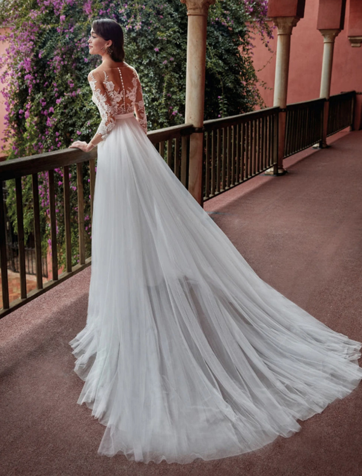 Chiffon bridal jumpsuit with V-neck and train