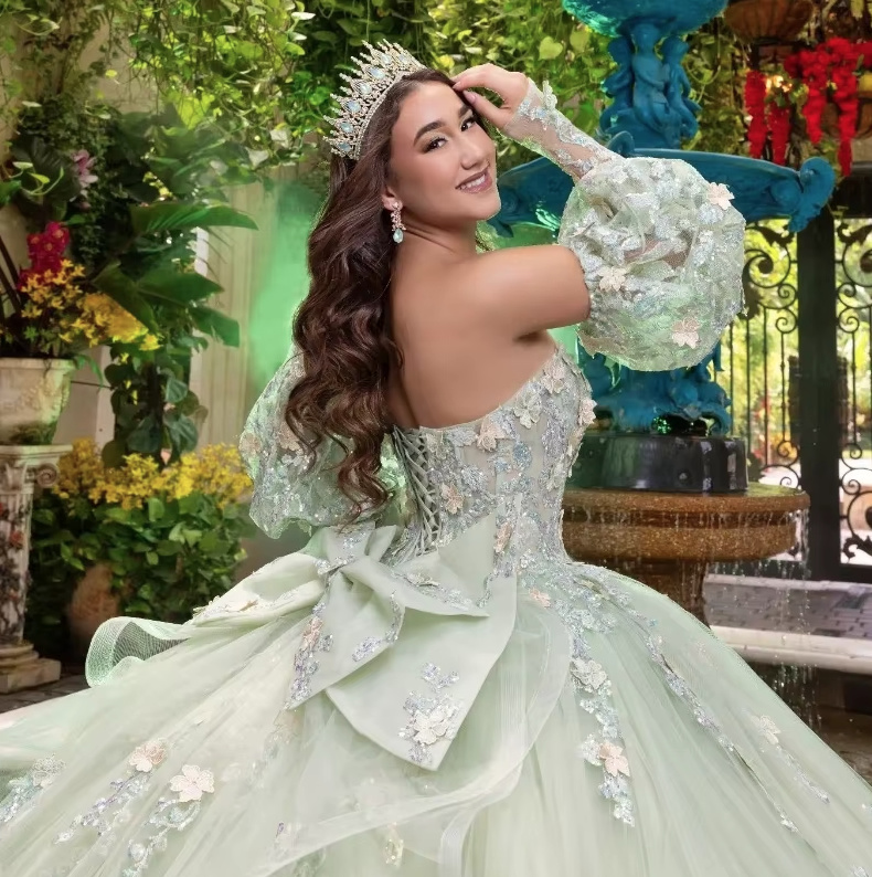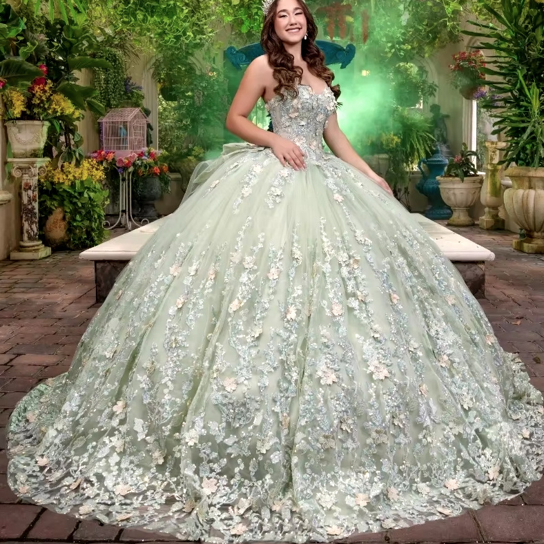 Ball Line Princess Wedding Dress Glittering in Light Green with Flower Appliques and Train Sleeves Detachable