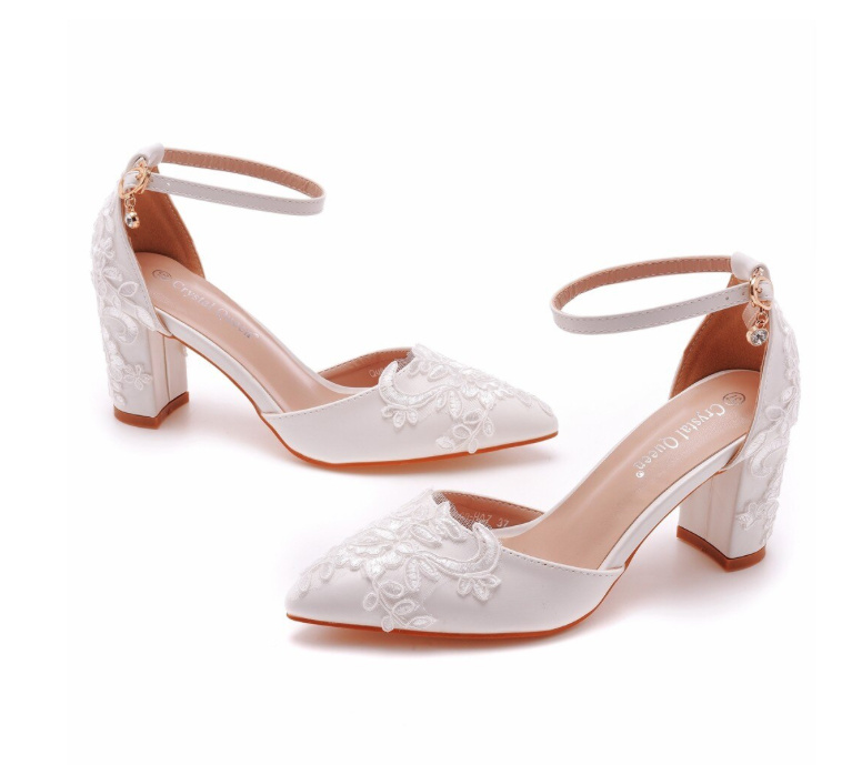 Block heel bridal shoes wedding shoes in white with ankle strap and lace