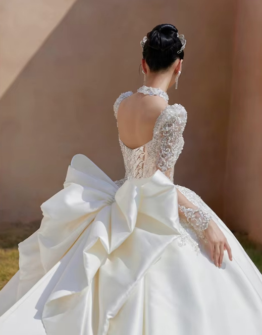 Luxury Long Sleeve Pearl Satin Wedding Dress Caylee with Train and Oversize Bow