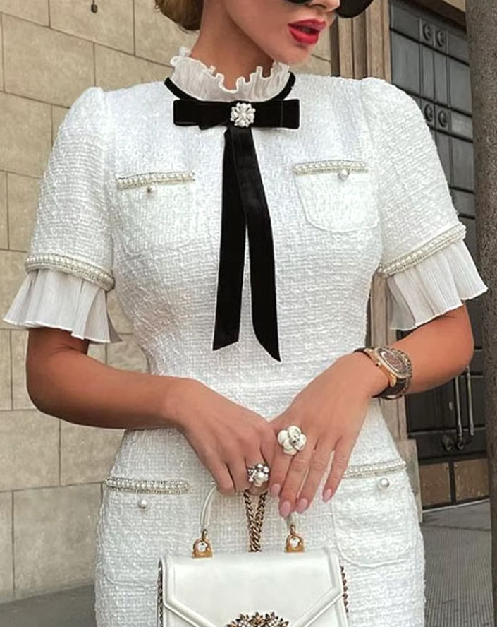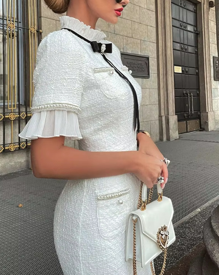 Pencil Tweed Short Sleeve Civil Ceremony Dress Calf Length Elegant in Vintage Style
