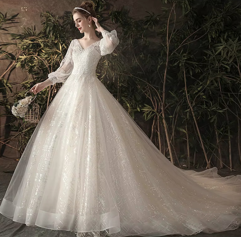 Classic Luxury Long Sleeve Glitter Wedding Dress Floor Length with Train