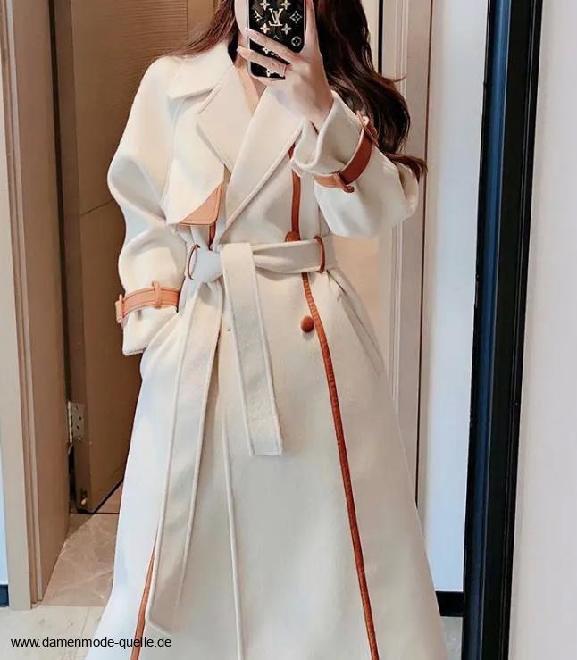 A Linie Damen Wollmantel Elegant in Weiß mit Applikationen und Gürtel