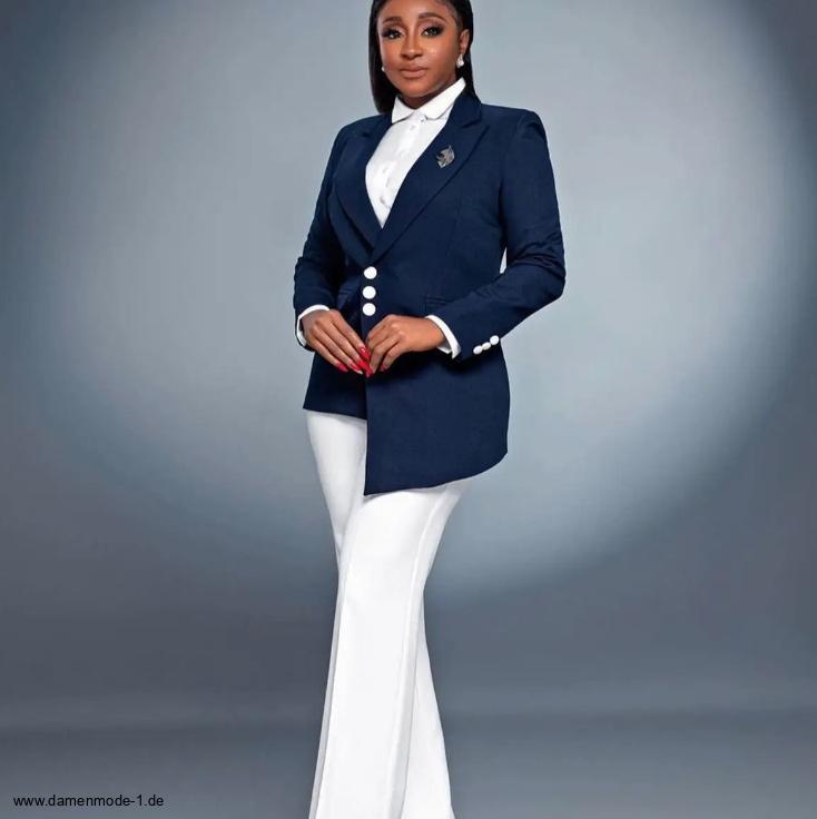Damen Hosenanzug in Marineblau Weiß Asymmetrisch Festlich