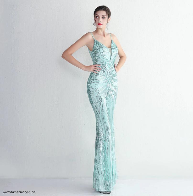 Fit and Flare Spaghettiträger Glitzer Pailletten Abendkleid Lang in Mintgrün