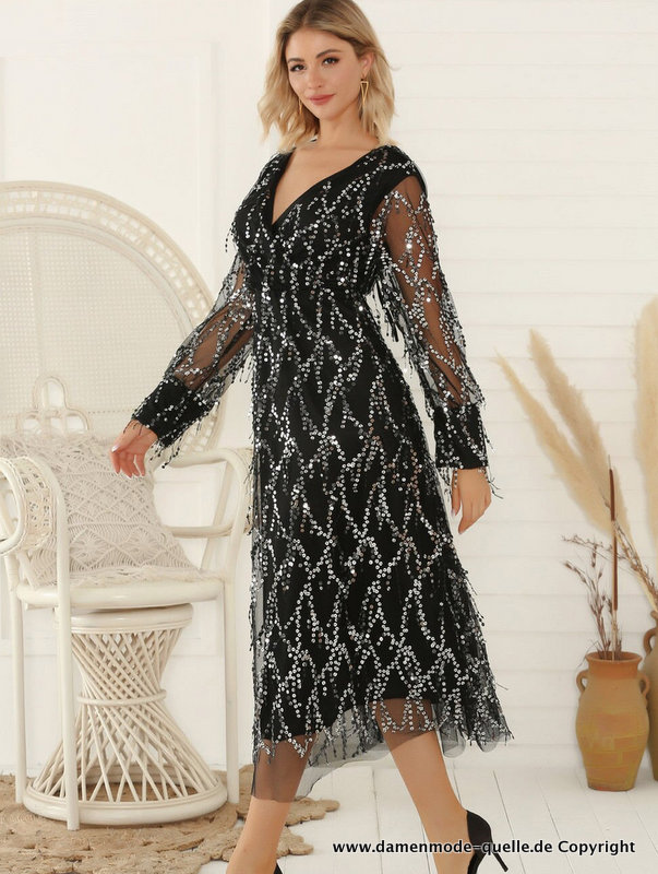 Elegantes Pailletten Glitzer Kleid in Schwarz Wadenlang