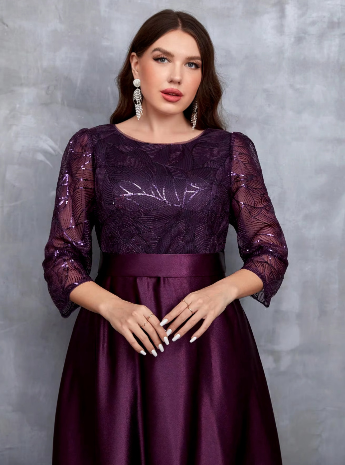 A Linie Langarm Maxikleid Elegant für Hochzeitsgäste in Lila mit Rundhals Ausschnitt