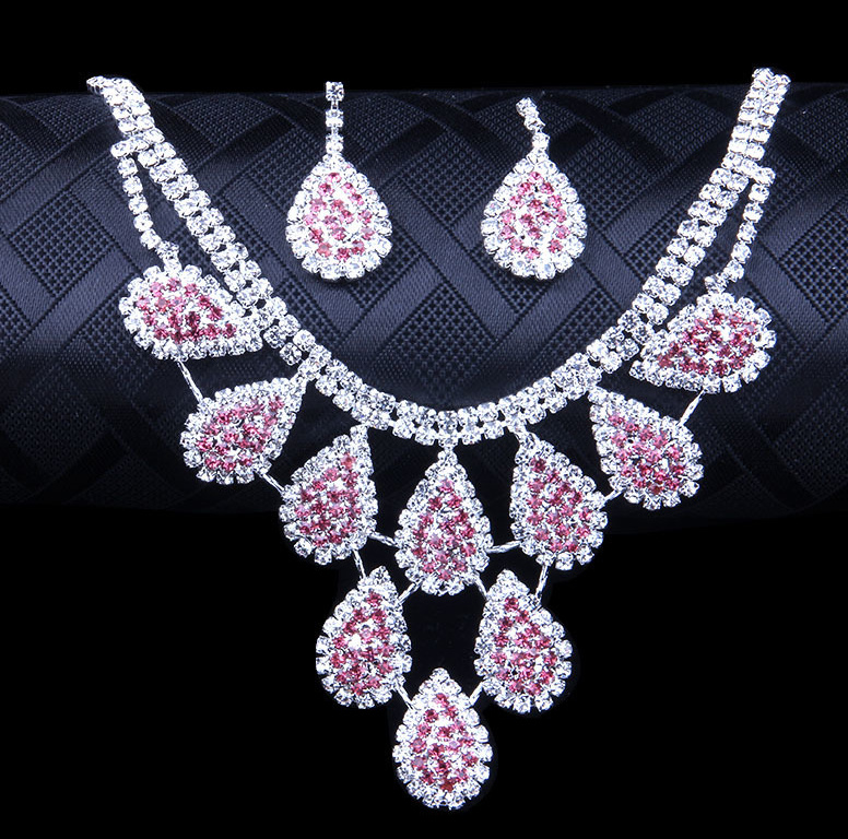 Cubic Zircon Rhinestone Bridal Jewelry Set Esther Necklace And Earrings Silver Pink