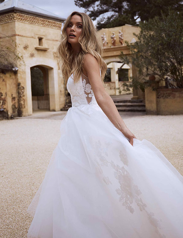 A-line spaghetti strap wedding dress Emira with floral lace floor length