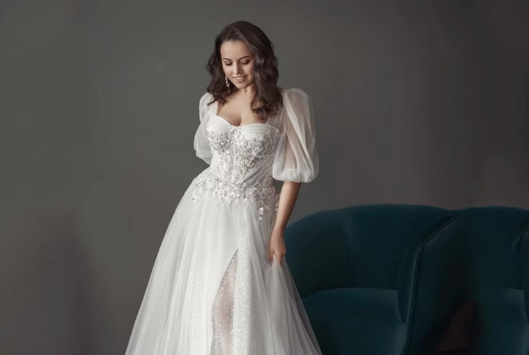 Heart Neckline Curvy Wedding Dress Cleo with Floral Lace and Tulle Sleeves