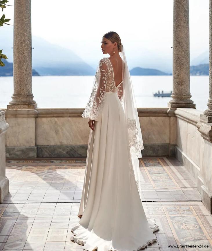 Boho Style Langarm Brautkleid Lani mit Tattoo Spitze und Schlitz Bodenlang