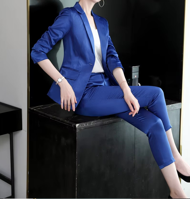 Satin Ladies Trouser Suit in Navy Blue Slim Fit Elegant