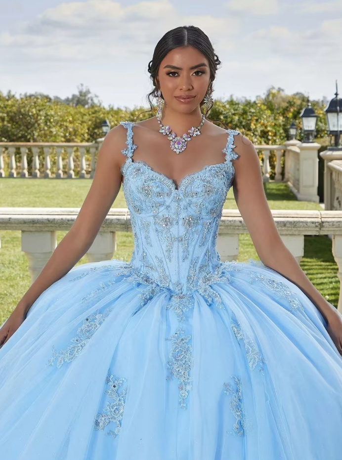 Spaghetti strap ball gown Carolina with rhinestones and lace in light blue