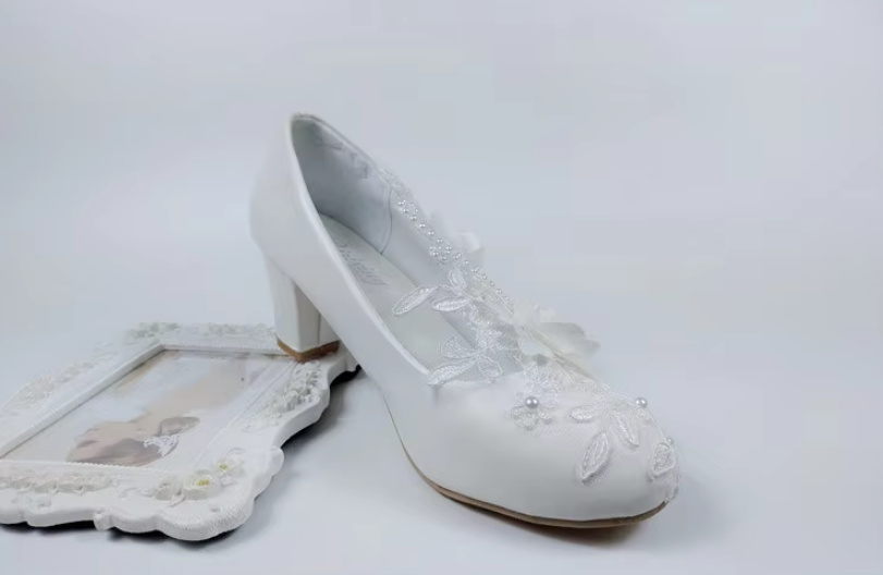 Block heel bridal shoes wedding shoes with lace and flowers in white
