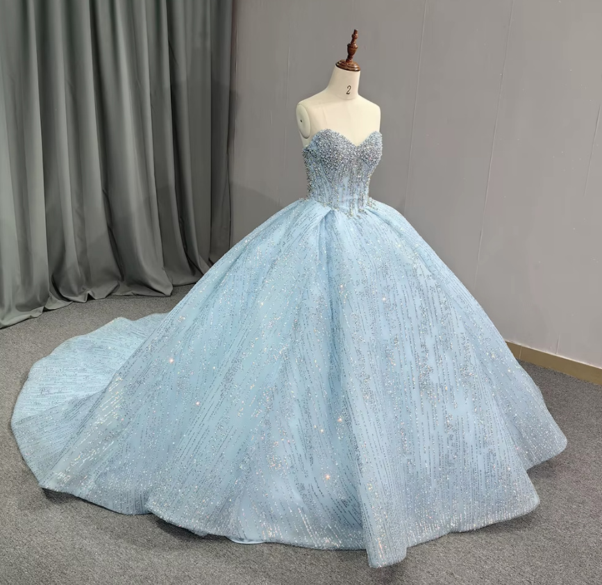 Off-the-shoulder luxury glitter wedding dress Caro in sky blue with train