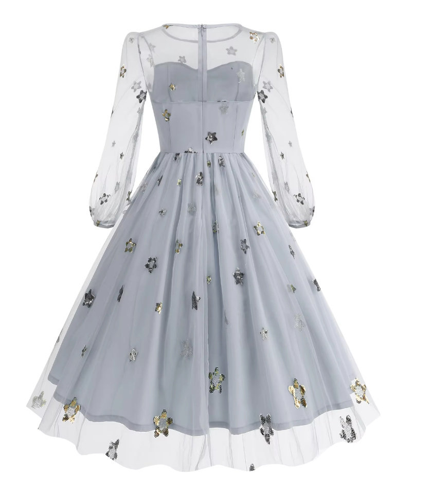 A Line Long Sleeve 50s Rockabilly Dress Knee Length in Silver with Sequin Flowers
