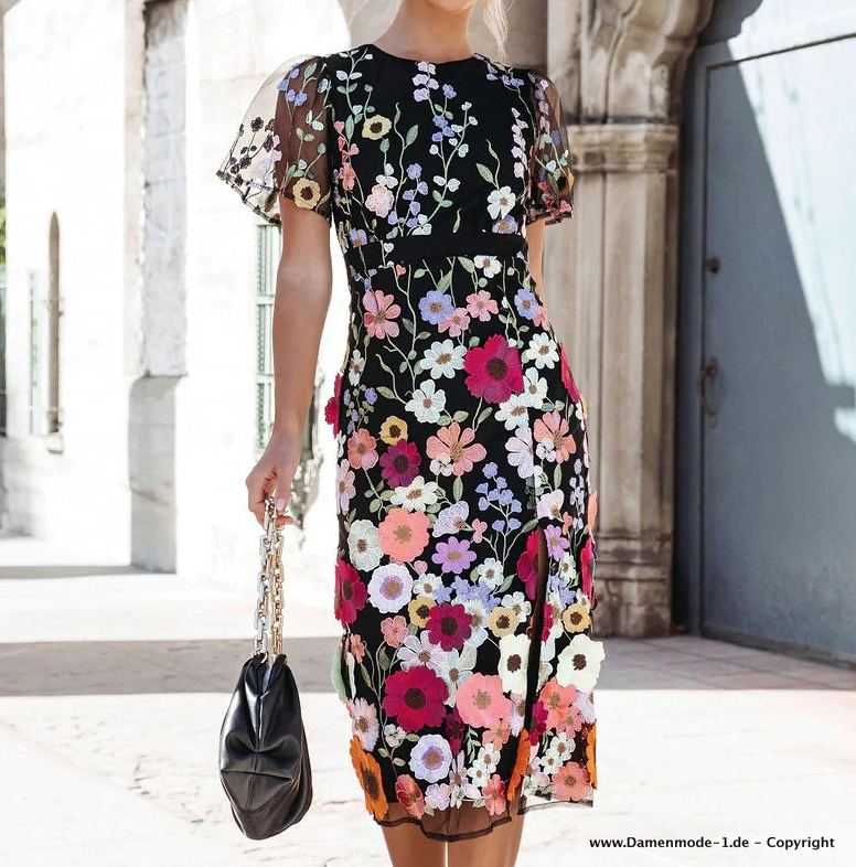 Pencil Short Sleeve Summer Dress Elegant in Black with Floral Pattern Calf Length