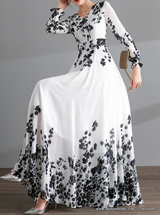 Langarm Maxi Chiffon Kleid Elegant in Weiß mit Blumen