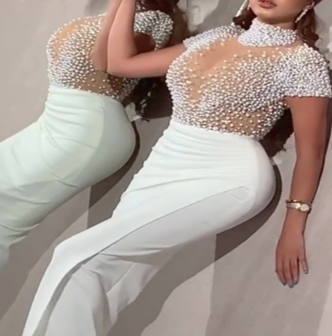 Sexy Mesh Pencil Civil Wedding Dress for Bride with Pearls