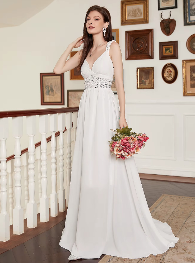 Sleeveless Empire Civil Wedding Dress in White with Sequins