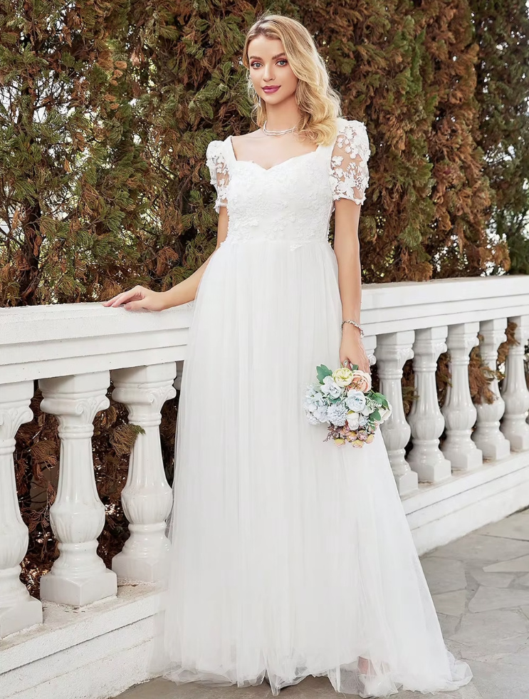 Short Sleeve A Line Civil Wedding Dress with Back Neckline Floor Length