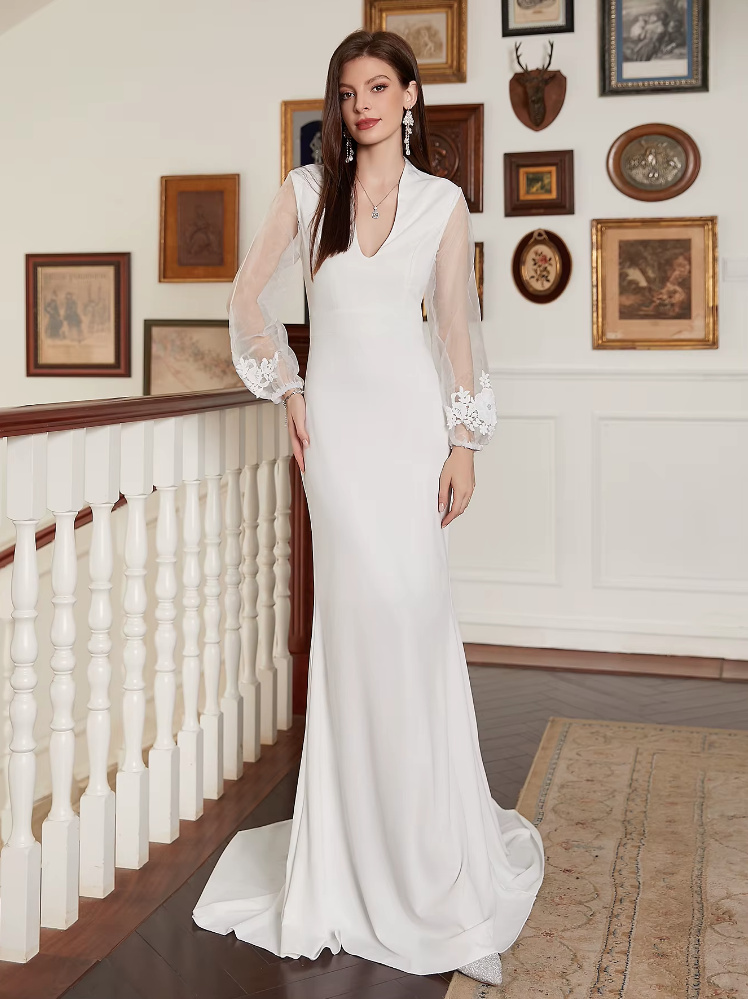Long-sleeved fit and flare civil wedding dress with brush train and mesh sleeves