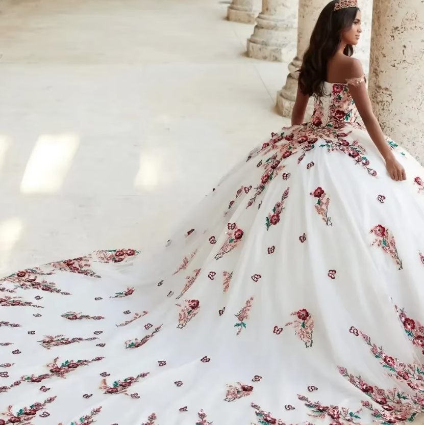 Off-the-shoulder ball gown wedding dress Dylane with floral embroidery and train