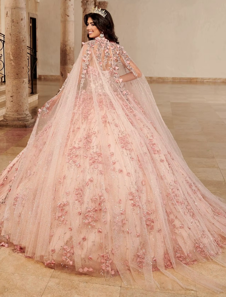 Off-the-shoulder ball gown Camellia with pearl sequins 3D flower appliqués and tulle cape in salmon