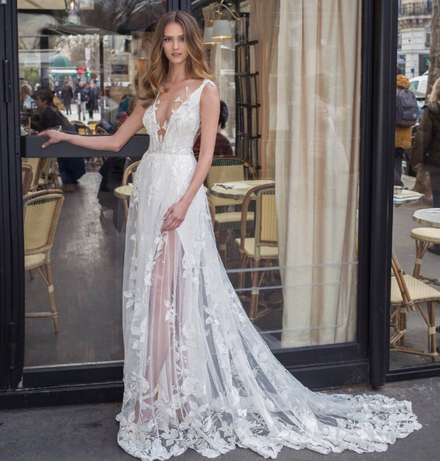 A line boho wedding dress Annkatrin with pearls and lace appliqués