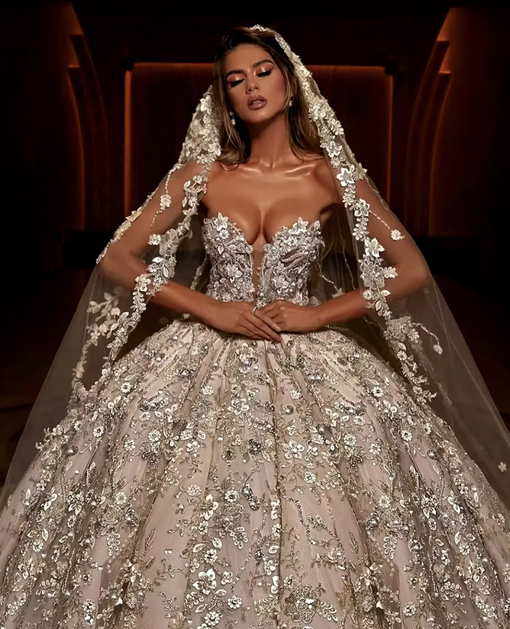 Princess Ball Gown Wedding Dress Devi with Sequins Flowers Embroidery and Chapel Train