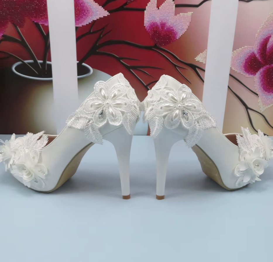 Wedding Shoes Round Toe Bridal High Heel with 3D Flowers in White