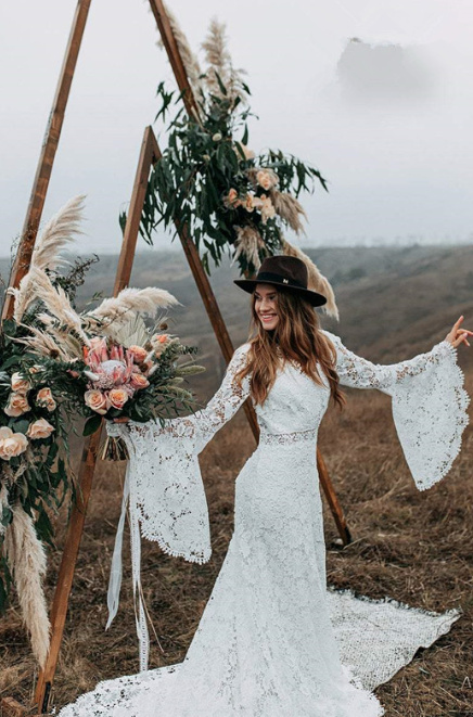 Vintage Boho Langarm Brautkleid Emelie aus Spitze und Rücken Ausschnitt