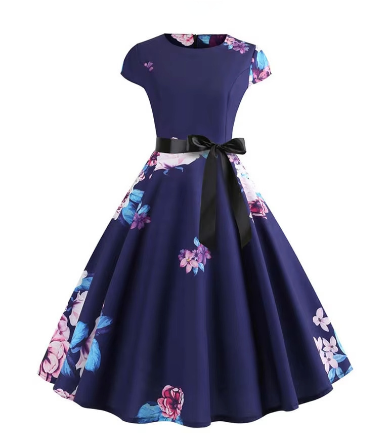 A Line Vintage 60s Rockabilly Dress Callisto Knee Length Dark Purple with Floral Pattern