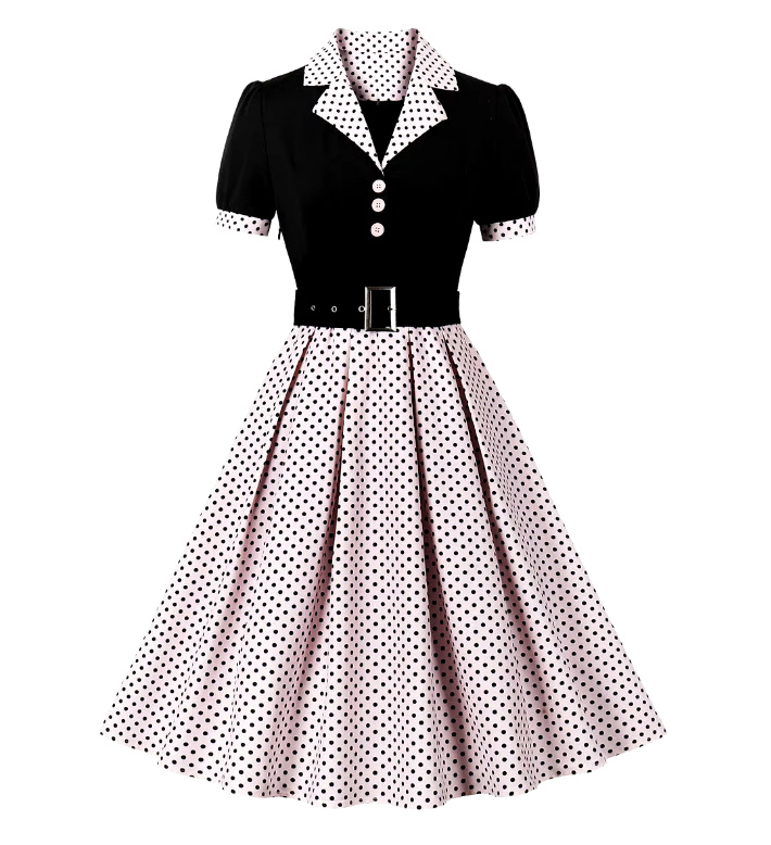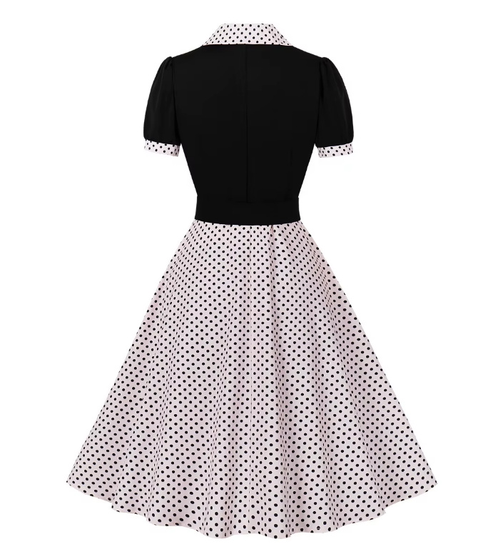 Short Sleeve A Line 50s Rockabilly Dress Celes Knee Length Black White Dotted