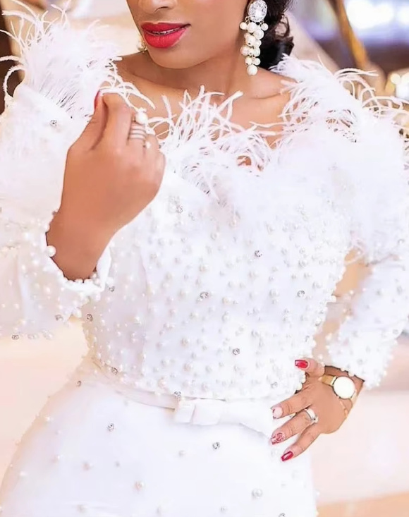 Long sleeve I line wedding dress Batjah with feathers and pearls