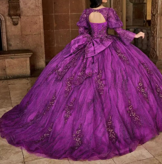 Princess Long Sleeve Ball Gown in Purple Backless with Sequin Embroidery