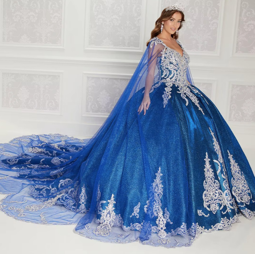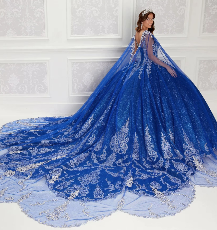 Quinceanera ball gown in royal blue with embroidery pearls tulle appliqués