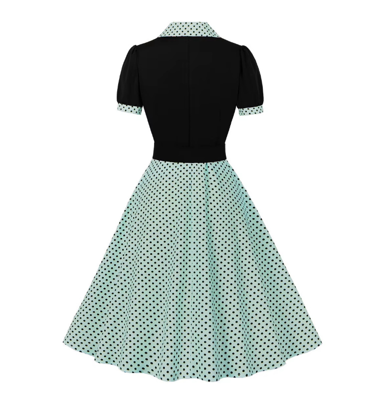 Short Sleeve A Line 50s Rockabilly Dress Celes Knee Length Light Green Black Dotted