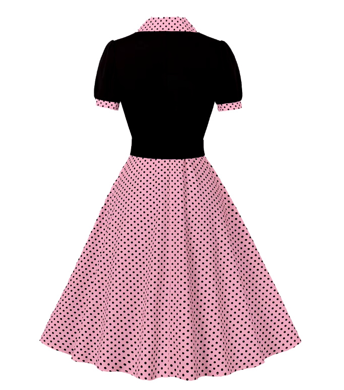 Short Sleeve A Line 50s Rockabilly Dress Celes Knee Length Pink Black Dotted