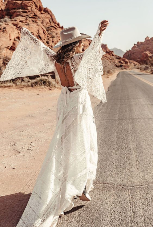 Long-sleeved boho wedding dress Eniz made of lace floor length with train