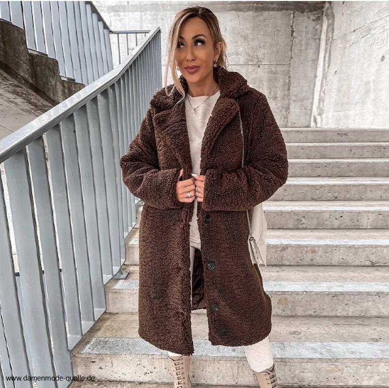 A Linie Damen Plüsch Wollmantel mit Kragen in Dunkelbraun