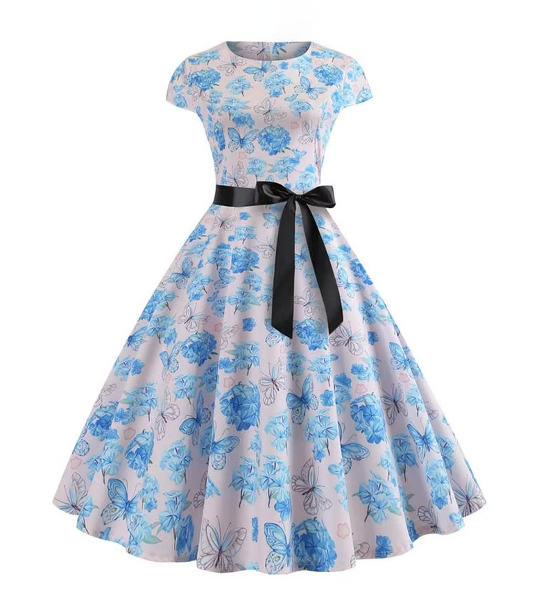 A Line Vintage 60s Rockabilly Dress Callisto Knee Length Light Blue with Floral Pattern and Butterflies