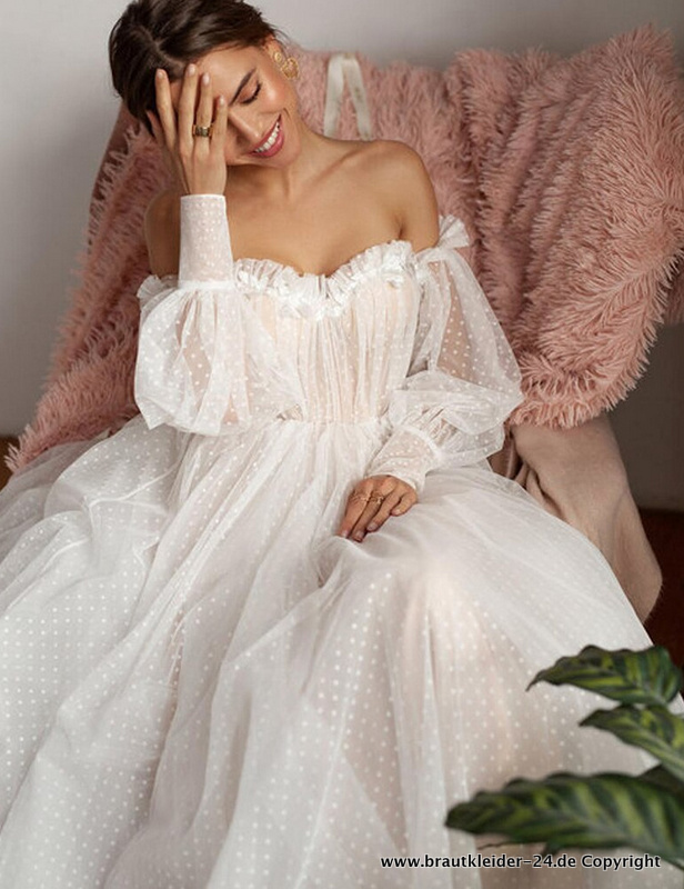 Bohostyle Tüll Brautkleid Hochzeitskleid mit Pinselschleppe Schulterfrei