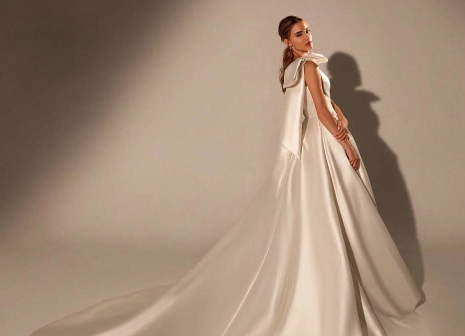 A line wedding dress Alexsandra with one shoulder straps and train in ivory