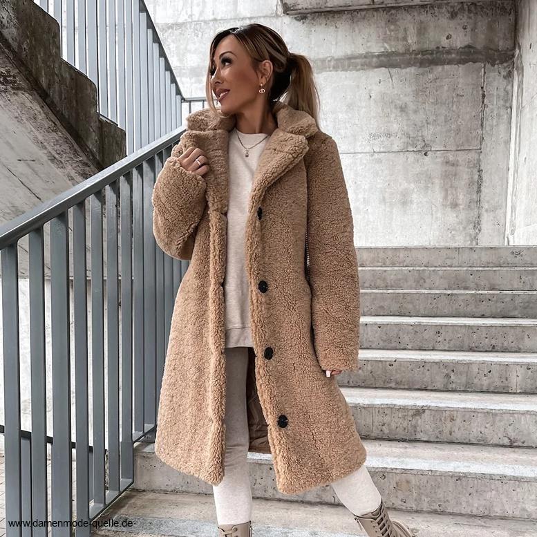 A Linie Damen Plüsch Wollmantel mit Kragen in Beige