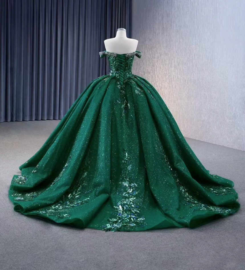 Ball line wedding dress Diana off shoulder in dark green with embroidery lace and rhinestones