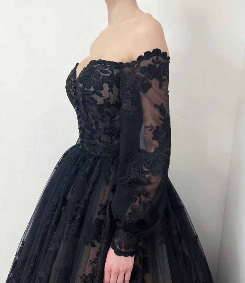 Romantic Gothic Wedding Dress Off Shoulder in Black with Lace
