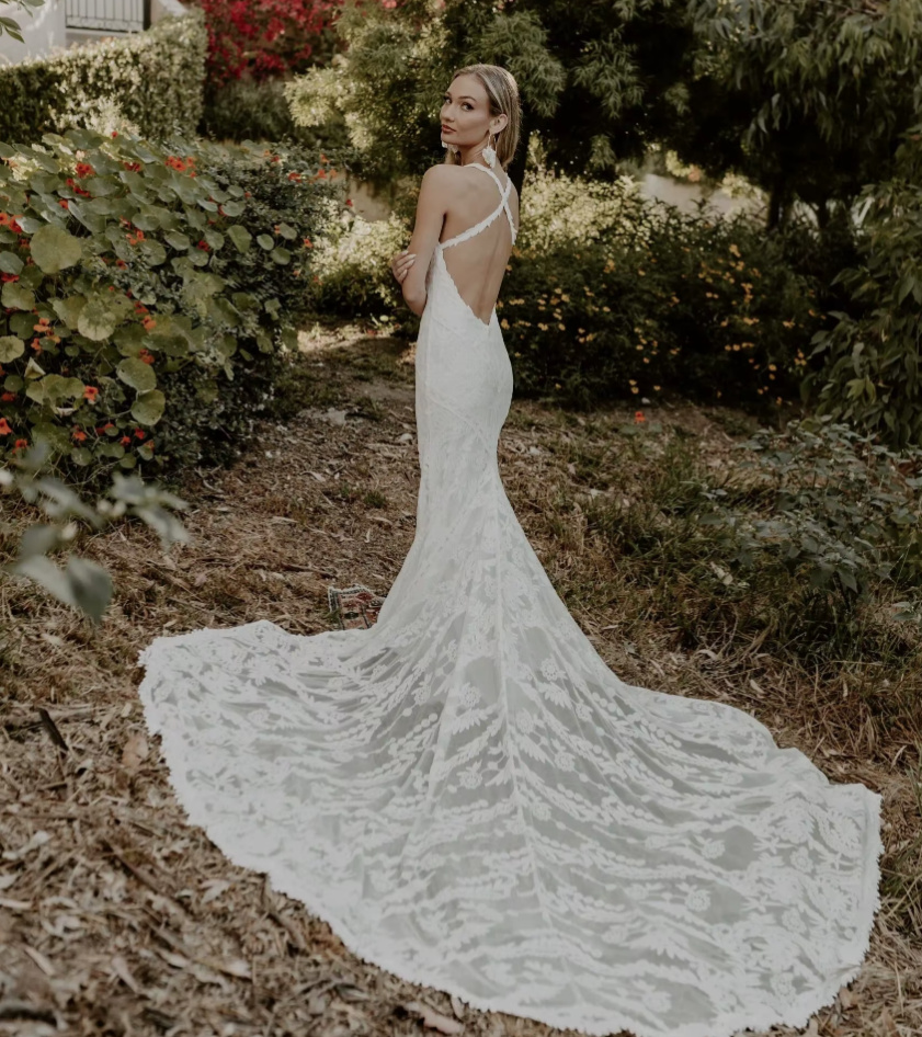 I Linie Boho Style Brautkleid Dala aus Spitze mit Schleppe und Kreuzträger
